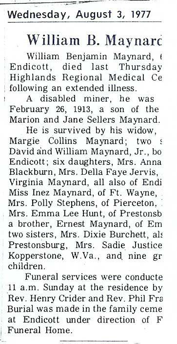 1948 Grant Music, 77, veteran of the Spanish-American War, died June 27 1948 in a hospital in Miami, Florida, after a short illness. Mr. Music had recently visited relatives here and in Floyd County and he suffered a stroke shortly after returning to his home in Florida. Born in the Little Paint section of Floyd County, he was a son of the late Thomas M. and Melissa Wilson Music. He is survived by one sister, Mrs. Anna Auxier, of East Point, several sons and daughters, and a host of other friends and relatives in this section. PAINTSVILLE HERALD WEDNESDAY Nov.12 1958 Submitted by Darrell Music music298@verizon.net MUSIC, Hattie May (England) 1908-1972 NORTH MANCHESTER - Mrs. Hattie May Music, Roann R.R. 1, died unexpectedly at her residence at 1 p.m. Monday. She was a native of Floyd County, Ky., born May 6, 1908 to Mr. and Mrs. William England. She had lived here since 1943. She married George W. Music May 18, 1926 and he survives with eight children, Mrs. Charles (Mary) Ross, Rapid City, S.D.; Frank Music, Mrs. Lloyd (Mildred) Hoffman, Charles Music, Mrs. Charles (Helen) Fitzgerald, all of North Manchester; George C. Music, Mrs. Robert (Ruth) Abshire, both of Wabash, and Bill Music, Laketon. Also surviving are 19 grandchildren and the following brothers and sisters, Mrs. Clora Miller and Mrs. Eva Slone, both of Kentucky; Silas England, Indiana; Mrs. Vica Hopkins, Warsaw, and Mrs. Maude Allen, Silver Lake. Friends may call after 7 p.m. today at the Bender Funeral Home. Services are scheduled there at 2 p.m. Thursday with the Rev. Glen Correll officiating. Burial will be in the Laketon Cemetery. Wabash Indiana April 25, 1972 Submitted by Darrell Music music298@verizon.net - MUSIC, Inez (Reid) 1914-1996 Inez Reid Music, of Auxier, died Monday, September 9, 1996 at the Highland Regional Medical Center. He was born in Lehi, Alabama, the daughter of Miles and Birdie Mohon Reid. She is survived by four sons, Mr. Charles Music of Auxier; Mr. Jerry Music of east point; Mr. Ben Music of Fort Wayne, Ind.; Mr. Kenneth Music of Beaver, Ohio; three daughters, Mrs. Ruth Ann Scott of Prestonsburg; Mrs. Ellie Goble of Stanton; 1 sister, Mrs. Darlene Lewis of Gatlinburg, Tenn., 16 grandchildren and 21 great-grandchildren. Services were September 11 at the Auxier Freewill Baptist church with the Reverend bobby Joe Spencer officiating. Burial services were in the Richmond Cemetery in Prestonsburg. Paintsville Herald September 1996 Submitted by Darrell Music music298@verizon.net