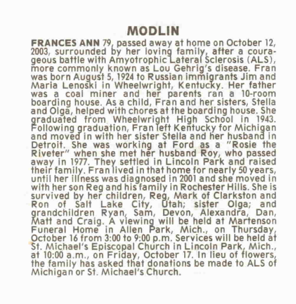 Age, 79, of Albion, Mich., passed away Saturday, July 28, 2001, at Trillium Hospital, Albion. She was born January 12, 1922, in Floyd County, Ky., the daughter of Jeff and Pearlie (Combs) Frasure. Rhoda had been employed at the Holiday Inn in Albion, Lynn Farms in Homer, and Alice"s Donut Factory. She enjoyed gardening, playing bingo, cooking, watching TV, and visiting with her family and friends. She was preceded in death by two husbands, Earl Wallen (1964) and Richard Magrum (2000). Survivors include nine daughters, Delois Smith of Ky., Birdie Howard of Oh., Wilma Patrick of Homer, Mi., Marcella Kopp of Port Huron, Mi., Faye Smith of Jonesville, Mi.; and Jean Combs, Janice Goble, Gay Haywood and Wanda Zaremba, all of Albion, Mi.; three sons, Glidden Wallen of Oh., Carlos Wallen of Coldwater, Mi., Harlos Wallen of Albion, Mi.; five step-children, John Magrum and Joseph Magrum, both of Florida, Patricia Pollman of Albion, Mi., Kathryn Murray and Michelle Patterson, both of Florida; two sisters, Dollie McKee of Ohio and Willadean Scott of Ky.; several grandchildren and great-grandchildren. Also preceding her in death was a daughter, Christine. Funeral services will be conducted Wednesday, August 1, at 1 p.m., at the J. Kevin Tidd Funeral Home, 811 Finley Drive, Albion, with Reverend Earl Martin and Ham Trusty officiating. Interment will follow at Albion Memory Gardens. Visitation was at the funeral home. Memorials may be made to Mrs. Magrum"s family. (FCT'S)