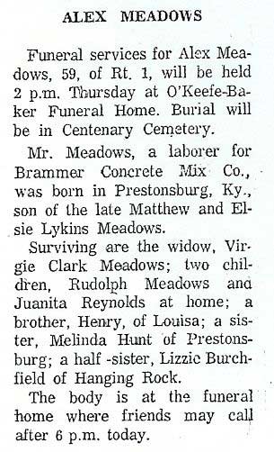 W.J. Music, 95, a native of Auxier and a resident of Paintsville for the past six years, died Monday October 16 1967, in the Paintsville Clinic. The retired miner left ten grandchildren and eleven great grandchildren. Born March 10 1872, he was the son of Alex and Sarah Burchett Music. He was a member of the Methodiust Church. Surviving in addition to wife, Nancy Sophranin Hibbit Music, are three daughters. They are Mrs. ?L. Pack, of Paintsville; Mrs. Lee A. Haney, of Hampton, Va.; and Mrs. W.E. Conley of Dayton, Ohio. Services were held Thursday October 4 at the Auxier Methodist Church with Rev. J.H. Burton officiating. Burial followed in the Ford Gap Cemetery at Auxier. The Preston Funeral Home was in charge of arrangements. Paintsville Herald Wednesday 3-10-1967 Submitted by Darrell Music music298@verizon.net