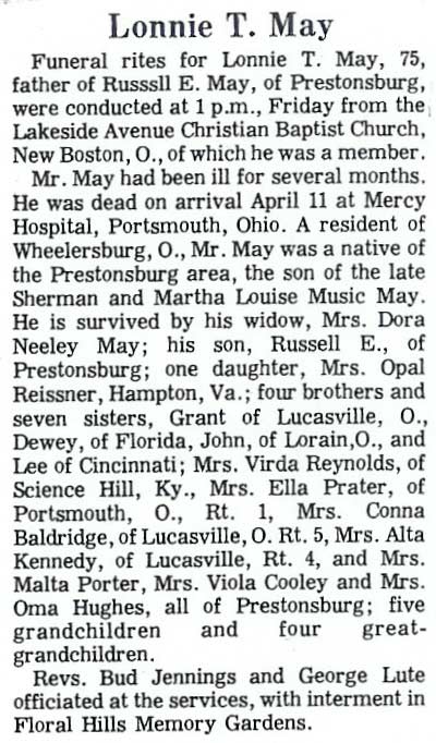 1906-1969 Ermine Music, born in Bonanza, Ky., Aug. 29, 1906, he was the son of John and Mahala Stanley Music. He was a maintenance man for the Erie-Lackawanna Railroad. Survivors include his wife, Cora, his mother, Mrs. Mahala Music of Indianapolis, nine daughters, Mrs. Donald {Josephine} Nedderman of Rt. 1 St. Marys., Mrs. Jerry {Doris Ann} Parker of Wapakoneta., Mrs. Phyllis Striff of Cridersville., Mrs. Donald {Ruth} Baker of 735 N. Elizabeth, Mrs. Kenneth {Donnie} Miller of Westminster, Miss Nellie Sue Music of Findlay, Mrs. Donald {Mary Ellen} McBride of Anchorage Alaska, and Brenda and Dora Lou, both at home, seven sons, Ermigean of 1119 Hill., William of 2401 Greenlawn Rd., Gordon of 205 N., Leonard, Douglas of 203 N. Baxter., Darrel of 210 S. Collet., and Hank and Ted both at home., six sisters, Mrs. Flossie Harmon of Ada., Mrs. Mabel Frasier of Noblesville, Ind., Mrs. Cynthia Frasier of Kentucky. Mrs. Mary Gibson of 607 Ford. Mrs. Hazel Howe of Indianpolis, and Mrs. Grace Myers of Noblesville. Ind., three brothers Raymond of Indianpolis, Sam of Walbridge and Warren of Michigan, and 22 grandchildren. Services will be 2 p.m. Monday in Siferd Westwood Church. 5-29-1969 Submitted by Darrell Music music298@verizon.net