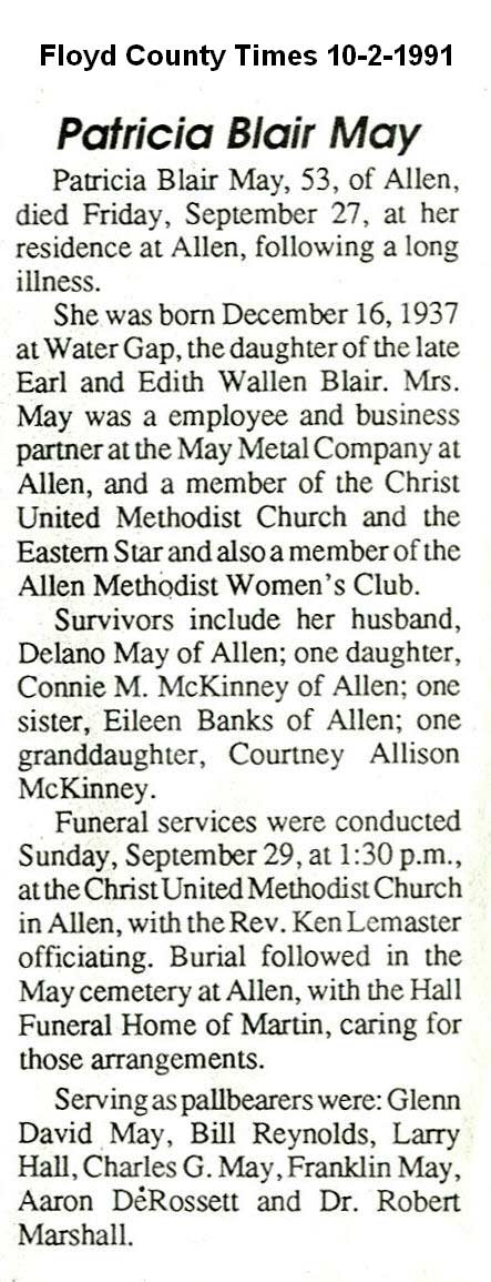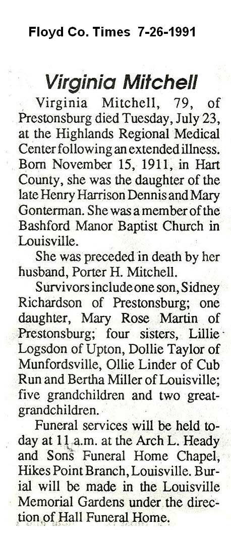 (Goble)1929-1969 East Point resident Mrs. Virginia Faye Music, 39, died suddenly at her home on Sunday June 8 1969. Funeral services were conducted today, Wednesday June 11 in the East Point Church of Christ with J.B. Short officiating. Interment followed in the Music Cemetery at Auxier. The Jones and Preston Funeral Home was in charge of arrangements. Born in Floyd County September 20 1929. She was the daughter of Lon Frank Goble and the late Vada McKinley Goble. Survivors including the father are the husband, Forrest Music, one daughter, Debra Faye Music at home; four brothers, Ruben Goble of West Van Lear; Thomas B. Goble and James E. GOble of Fort Wayne, Indiana; and Franklin Goble of Wabash, Indiana; and one sister, Mrs. Eula Mae Allen of Fort Wayne, Indiana. Paintsville Herald Wednesday 6-11-1969 Submitted by Darrell Music music298@verizon.net