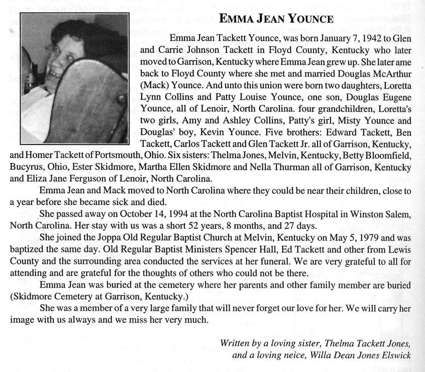 Obit New Salem Association Minutes 1995 YOUNCE, Emma Jean B: 1-7-1942, D: 10-14-1994 Winston Salem, N.C. Buried: Skidmore Cemetery, Garrison, Ky., d/o Glen & Carrie Johnson Tackett w/o Douglas McArthur (Mack) Younce, children: Loretta Lynn, Patty Louise & Douglas Eugene bro-sis: Edward, Ben, Homer,Thelma, Betty, Ester, Martha Ellen, Nella &, Eliza Jane YOUNCE, Gennis C. Age, 63, of East Point, died Tuesday, July 8, 2008, at his residence. Born December 25, 1944, in Martin, he was the son of the late Sylvester and Rebecca Garrett Younce. Survivors include his brothers and sisters-in-law: Cledith (Elsie) Younce of Greenville, Tennessee; Sylvester (Kathy) Younce of Silver Springs, Florida; Wendell Younce of Springfield, Virginia; his sisters and brothers-in-law: Dottie Hastings and Trena (Woody) Ratliff, both of East Point; and Vonda Ladd of Petersburg, Michigan; and several nieces, nephews, great-nieces and nephews. In addition to his parents, he was preceded in death by a brother, Delmon Younce. Funeral services will be held Friday, July 11, at 2 p.m., at Nelson-Frazier Funeral Home, in Martin, with Manford Fannin and Phillip Ramey officiating. Burial will be in Davidson Memorial Gardens, in Ivel, under the direction of Nelson-Frazier Funeral Home. Pallbearers: Woody Ratliff, Thomas Hastings, Neile Osborne, Tommy Neile Osborne, Rodney Holbrook, Rudy Elbert Pennington, and Tommy Hastings. (Published: Friday, July 11, 2008 FCT'S)
