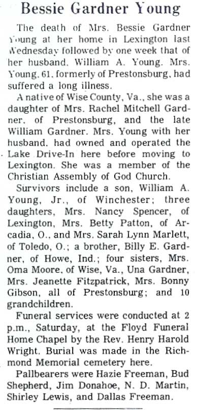 Age, 97, of East Point, died Sunday, September 28, 2003, at Highlands Regional Medical Center, Prestonsburg. Born May 25, 1906, in Oneida, Tennessee, he was the son of the late William Riley and Ella Phillips Younce. He was a retired gas company employee; a member of the Third Avenue Freewill Baptist Church, where he was a deacon for 50 some years; a Kentucky Colonel; a member of Zebulon Masonic Lodge, 273, in Prestonsburg, and a veteran of World War I, serving in the Army and Navy. He was preceded in death by his wife, Rebecca Garrett Younce. Survivors include his sons and daughters-in-law, Cledith (wife, Elsie) Younce of Greenville, Tennessee, Sylvester Jr., (wife, Kathy) Younce of Silver Springs, Florida, Delmon (wife, Elsie) Younce of Las Vegas, Nevada, Wendell Younce of Springfield, Virginia, Gennis Younce of East Point; daughters and sons-in-law, Vonda (husband, Bill) Ladd of Petersburg, Michigan, Dottie Hastings of East Point, Trena (husband, Woody) Ratliff, of East Point; 14 grandchildren, 24 great-grandchildren, and two great-great-grandchildren. In addition to his parents and wife, he was preceded in death by five brothers, Luther Younce, Zelmer Younce, Holbrook Younce, John Younce, and Bergan Younce; and four sisters, Anna Mae Younce, Elsie Pennington, Dorothy Baldridge, and Emma Reed. Funeral services will be conducted Wednesday, October 1, at 1 p.m., at the Nelson-Frazier Funeral Home, Martin, with Manford Fannin, Bill Campbell, and Cledith Younce officiating. Burial will be in the Davidson Memorial Gardens, at Ivel, under the direction of Nelson-Frazier Funeral Home. Visitation is at the funeral home, and services were held Tuesday evening. Active pallbearers: Woody Ratliff, Tom Hastings, Neile Osborne, Richard Younce, David Younce, Rodney Holbrook, Warren Blanton, and Danny Baldridge. Honorary pallbearers: Gennis Younce, Bill Ladd, Leon Younce, Bill Calhoun, Charles Gray, Bill Miller, Fletcher Gayheart, James Stanley and Ronnie Combs. (FCT'S) YOUNG, Bessie Gardner Obit Submitted by From the scrapbook of Cora Coburn Meadows (FCT'S)