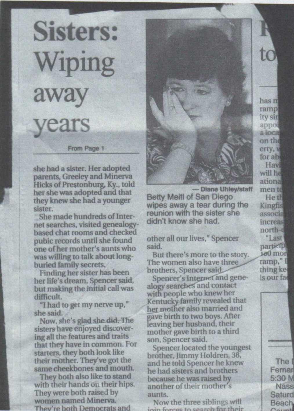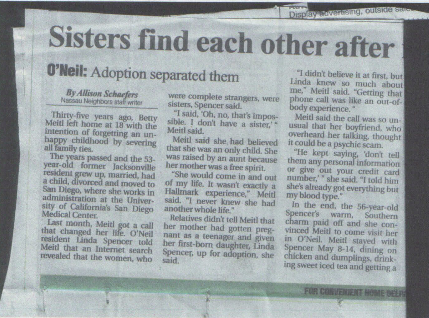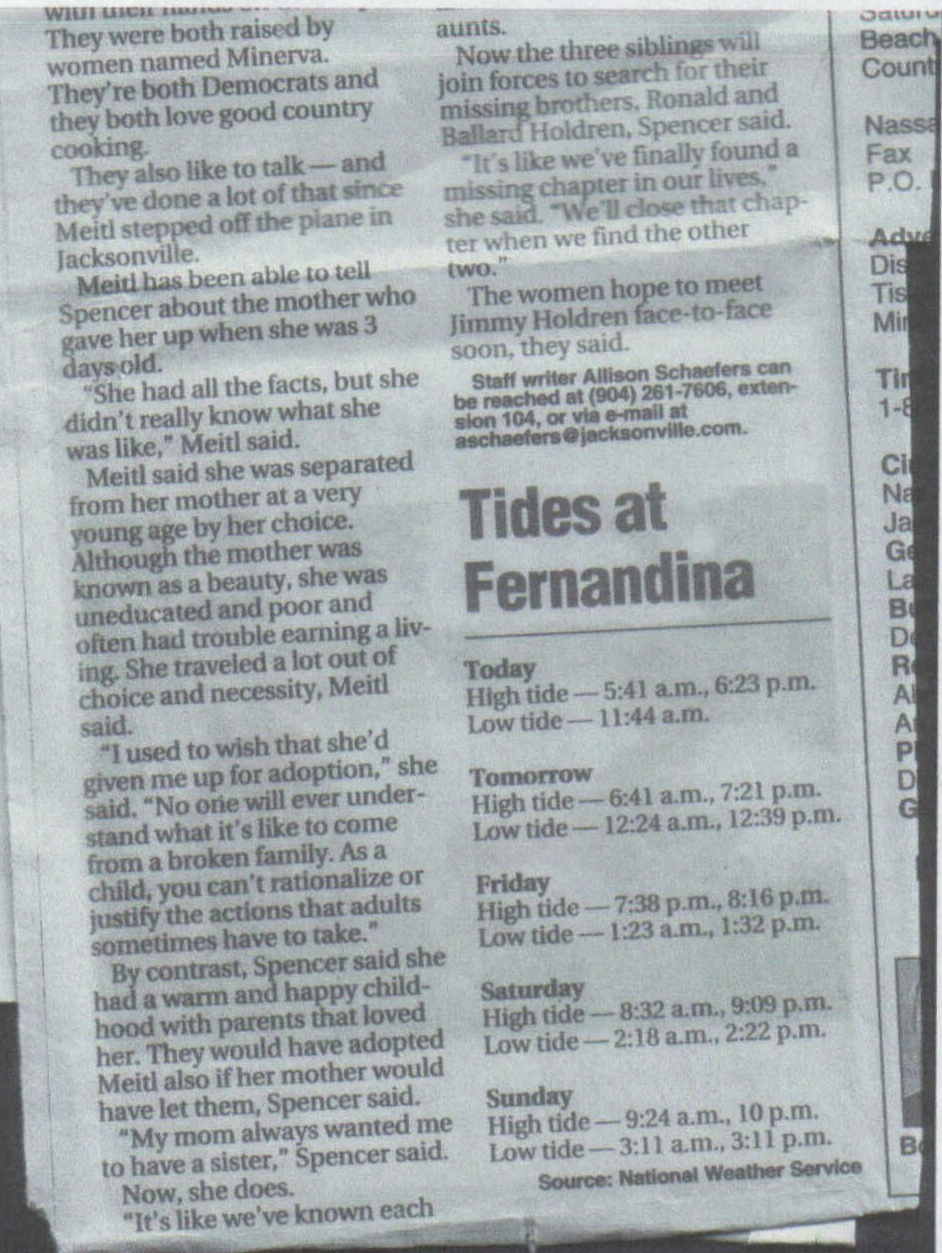 Betty Meitl and Linda Spencer are reunited. Later they discover three brothers: Ronald, Ballard, and Jimmy Holdren. Story from the Jackonsville, FL paper.