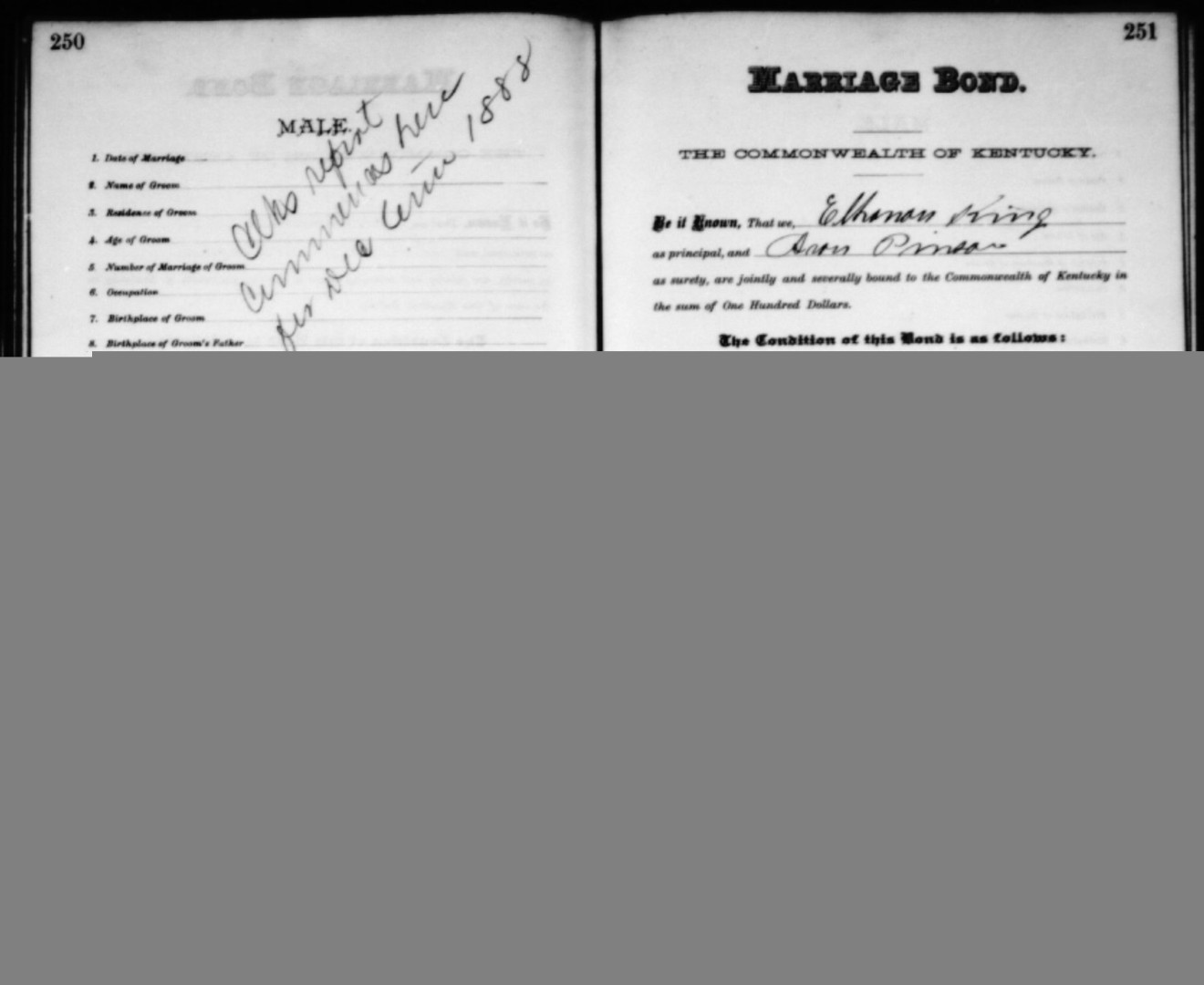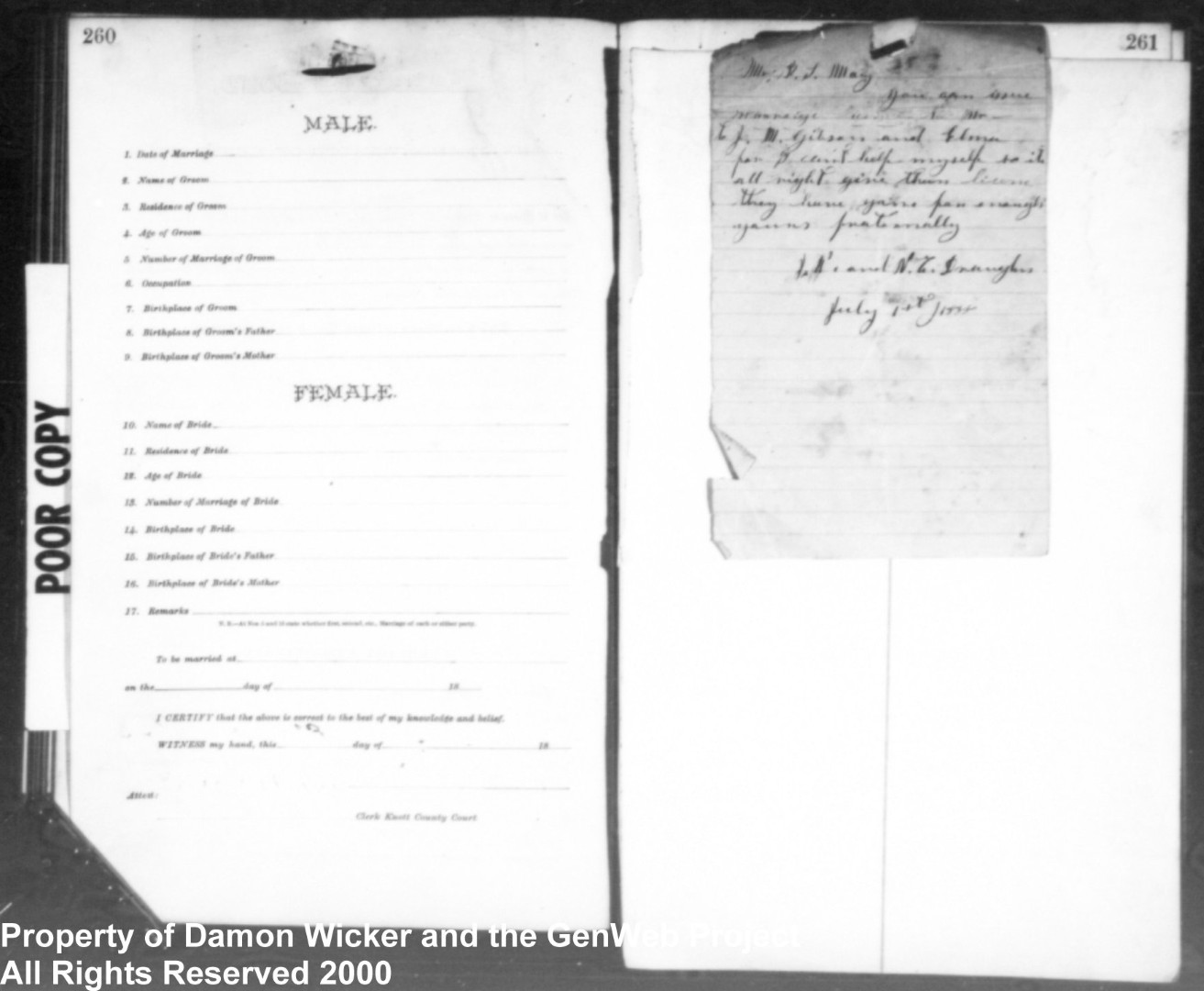 | Williams | JohnR | Hagans | Vina (colored) | 1890-12-25 | ***Permission Slip *** | |||||