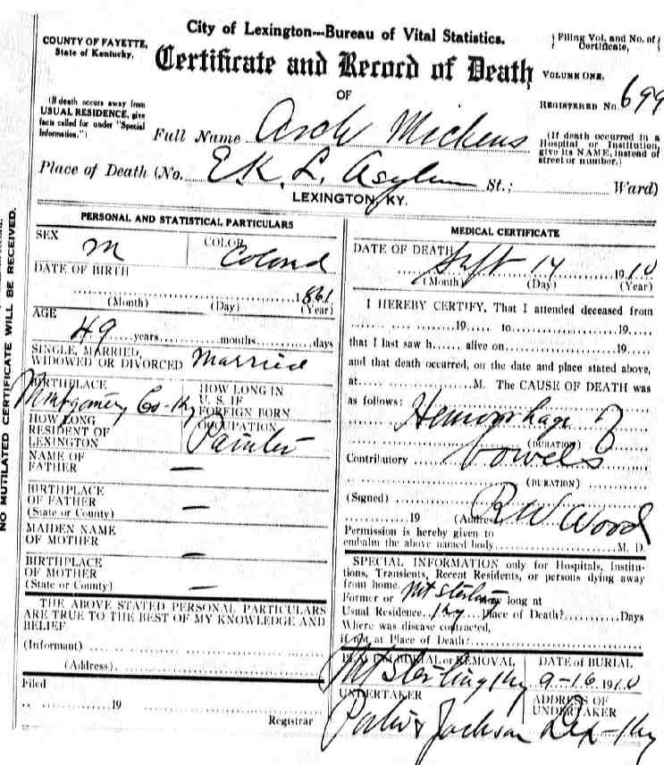 of Abraham and Emily (maiden name unknown) Mickens of Cuckoo, Louisa, VA