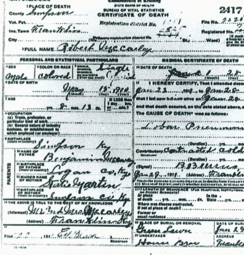 Date of Death: 28 January 1911 Place of Death: Simpson Co., KY Race or Color: Colored Sex: Male Marital Status: Single Cause of Death: Labor Pneumonia Place of Burial: Green Lawn Residence: Occupation: Date of Birth: 15 May 1910 Age: 8 months 13 days Birth Place: Simpson, KY Father's Name: Benjamin McCarley Birth Place of Father: Logan Co., KY Mother's Name: Statie Martin Birth Place of Mother: Simpson Co., KY Informant: Mr. and Mrs. McCarley