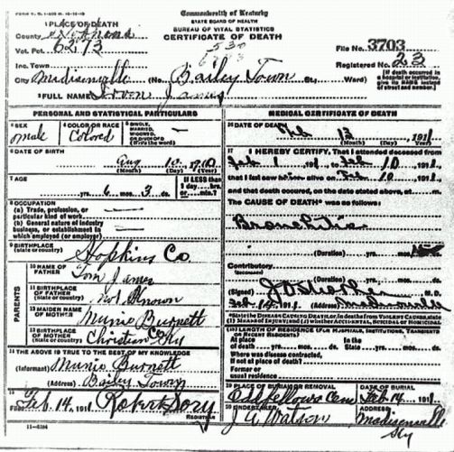 Date of Death: 13 February 1911 Place of Death: Madisonville, Hopkins Co., KY Race or Color: Colored Sex: Male Marital Status: Cause of Death: Bronchitis Place of Burial: Oddfellows Cemetery Residence: Occupation: Date of Birth: 10 August 1910 Age: 6 months 3 days Birth Place: Hopkins Co., KY Father's Name: Tom James Birth Place of Father: Not Known Mother's Name: Munie Burnett Birth Place of Mother: Christian Co., KY Informant: Munie Burnett