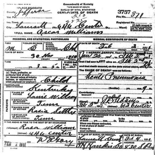 Date of Death: 2 February 1911 Place of Death: Louisville, Jefferson Co., KY Race or Color: C Sex: M Marital Status: Child Cause of Death: Acute Pneumonia Place of Burial: Louisville Cemetery Residence: Occupation: Date of Birth: 30 November 1910 Age: 3 months 5 days Birth Place: Kentucky Father's Name: Louie Williams Birth Place of Father: Tenn Mother's Name: Rosia Settles Birth Place of Mother: Tenn Informant: Rosa Williams