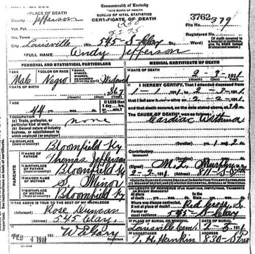 Date of Death: 2 February 1911 Place of Death: Louisville, Jefferson Co., KY Race or Color: Negro Sex: Male Marital Status: Widowed Cause of Death: Cardiac Asthma Place of Burial: Louisville Cemetery Residence: Occupation: None Date of Birth: 1867 Age: 44 Birth Place: Bloomfield, KY Father's Name: Thomas Jefferson Birth Place of Father: Bloomfield, KY Mother's Name: S. Minor Birth Place of Mother: Bloomfield, KY Informant: Rose Dunran