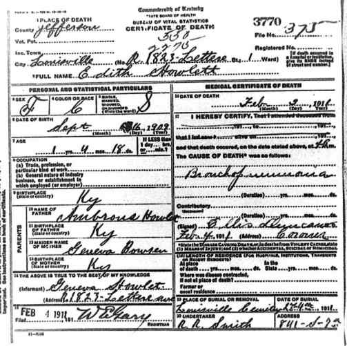 Date of Death: 3 February 1911 Place of Death: Louisville, Jefferson Co., KY Race or Color: C Sex: F Marital Status: S Cause of Death: Bronch Pneumonia Place of Burial: Louisville Cemetery Residence: Occupation: Date of Birth: 16 September 1909 Age: 1 year 4 months 18 days Birth Place: KY Father's Name: Ambrous Howlett Birth Place of Father: KY Mother's Name: Geneva Bowren Birth Place of Mother: KY Informant: Geneva Howlet