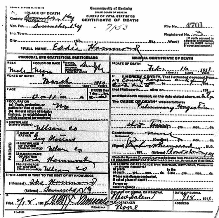 Date of Death: 16 February 1911 Place of Death: Nelson Co., KY Race or Color: Negro Sex: Male Marital Status: Single Cause of Death: Pulmonary Congestion Place of Burial: New Salem Residence: Occupation: No Date of Birth: March 1910 Age: 11 months Birth Place: Nelson Co., KY Father's Name: Gary Hatton Birth Place of Father: Nelson Co., KY Mother's Name: Rosa Hammond Birth Place of Mother: Nelson Co., KY Informant: The Hammond