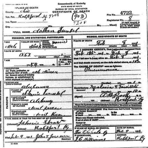 Date of Death: 8 February 1911 Place of Death: Ohio Co., KY Race or Color: Black Sex: Male Marital Status: Married Cause of Death: Pneumonia Place of Burial: Residence: Occupation: Col Miner Date of Birth: 1867 Age: 54 Birth Place: Alabama Father's Name: Irvine Tunsel Birth Place of Father: Alabama Mother's Name: Don't Know Birth Place of Mother: Don't Know Informant: Johnie Short