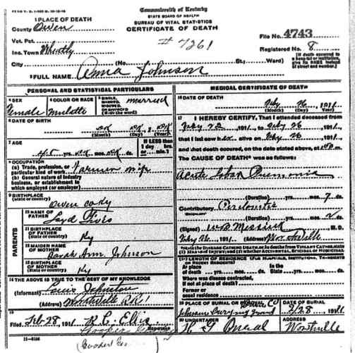 Date of Death: 26 February 1911 Place of Death: Owen Co., KY Race or Color: Mullatto Sex: Female Marital Status: Married Cause of Death: Acute Labor Pneumonia Place of Burial: Johnson Burial Ground Residence: Occupation: Farmer Wife Date of Birth: DK Age: 45 Birth Place: Owen Co., KY Father's Name: Loyd Fives Birth Place of Father: KY Mother's Name: Sarah Ann Johnson Birth Place of Mother: KY Informant: Lewis Johnston