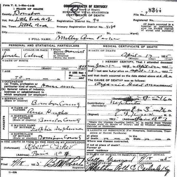 Colored Sex: Female pouse's Name: Spouse's Age: Cause of Death: Place of Burial: Letton Graveyard, Little Rock- Jackstown Rd., Bourbon Co., Ky. Date of Burial: 18 Apr 1925 Residence: Bourbon Co., Ky. Occupation: House Work Date of Birth: About 1855 Age: 70 Birth Place: Bourbon Co., Ky. Father's Name: Ance