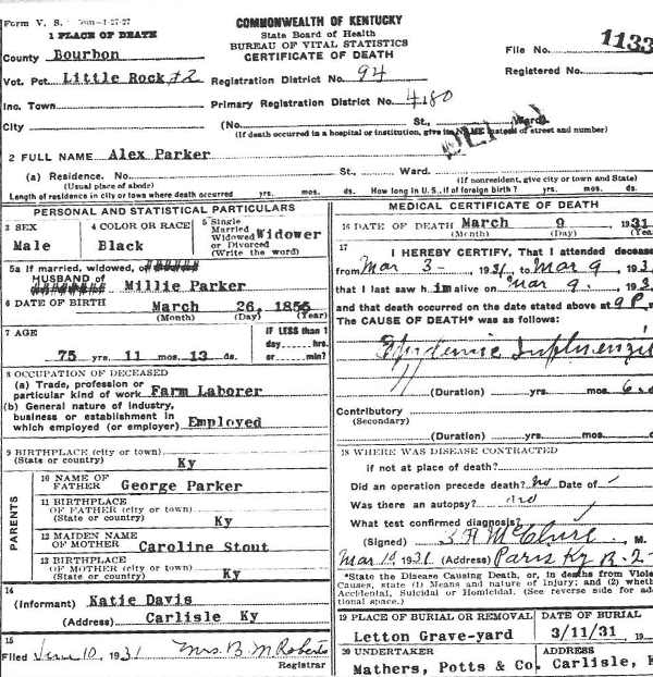 20:03:42 2006 Given Name: Alex Date of Death: 09 Mar 1931 Place of Death: Bourbon Co., Ky. Race or Color: Colored Sex: Male Marital Status: Widower Spouse's Name: Millie Spouse's Age: Cause of Death: Epidemic Influenza Place of Burial: Letton Graveyard, Little Rock- Jackstown Rd., Bourbon Co., Ky. Date of Burial: 11 Mar 1931 Residence: Bourbon Co., Ky. Occupation: Farm laborer Date of Birth: 26 Mar