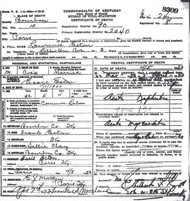 | Date: Thu Mar 23 19:17:16 2006 Submitter: Mary Hatton Death Volume: 1933 Certificate Number: 8309 Surname: ECTON Given Name: Lawrence Date of Death: 05 Apr 1933 Place of Death: Lilleston Ave., Paris, Bourbon Co., Ky. Race or Color: Colored Sex: Male Marital Status: Married Spouse's Name: Essie Ecton Spouse's Age: Cause of Death: Acute Nephritis & Acute Myocarditis Place of Burial: Paris, Bourbon Co., Ky. Date of Burial: 08 Apr 1933 Residence: Lilleston Ave., Paris, Bourbon Co., Ky. Occupation: Common Labor Date of Birth: 01 Jan 1900 Age: 32 Birth Place: Bourbon Co., Ky. Father's Name: Frank Ecton Father's Birth Place: Kentucky Mother's Name: Sallie Clay Mother's Birth Place: Kentucky Informant: Essie Ecton, Lilleston Ave., Paris, Bourbon Co., Ky. Undertaker: E. J. Martyn Comments and Corrections: