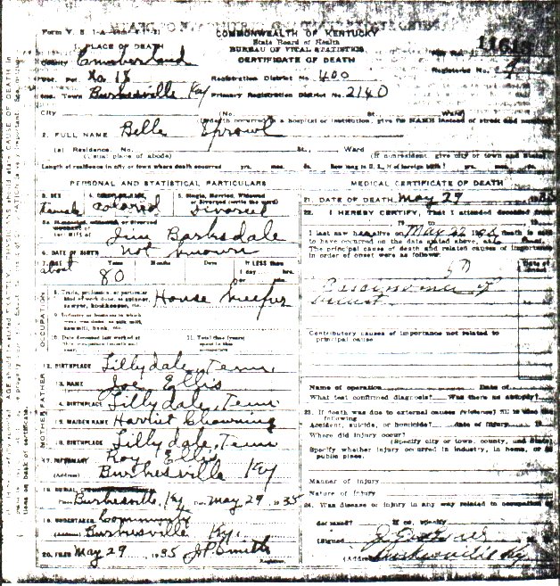| Date: Fri Jan 5 2006 Email: miki5445@aol.com Submitter: Rosanne Miller Cleveland Death Volume: 1936 Certificate Number: 11613 Surname: Sprowl Given Name: Belle Date of Death: 29 May 1935 Place of Death: Cumberland Co., KY Race or Color: Colored Sex: female Marital Status: Divorced Spouse's Name: Jim Barlesdale Spouse's Age: Cause of Death: Carcinoma of Breast Place of Burial: Burkesville, KY Date of Burial: 29 May 1935 Residence: Occupation: House Keeper Date of Birth: Not Known Age: 80 Birth Place: Lillydale, TN Father's Name: Joe Ellis Father's Birth Place: Lillydale, TN Mother's Name: Harriet Chawning Mother's Birth Place: Lillydale, Tn Informant: Roy Ellis Undertaker: Community