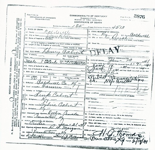| Submitter: Peggy Gilkey Death Volume: 1941 Certificate Number: 03876 Surname: CALVERT Given Name: Henry Date of Death: 19 January 1941 Place of Death: Princeton, Caldwell Co., KY Race or Color: Clord Sex: Male Marital Status: Widowed Spouse's Name: Spouse's Age: Cause of Death: Miteral Regurtation ch. Nephritus Place of Burial: Crider Residence: Occupation: Farmer Date of Birth: Age: 70 Birth Place: Caldwell Co., KY Father's Name: Link CALVERT Father's Birth Place: KY Mother's Name: Sylvia CALVERT Mother's Birth Place: KY Informant: Evelyn CALVERT, Princeton, KY