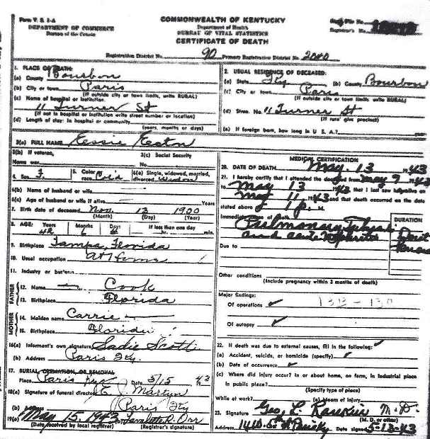 | Date: Thu Mar 23 19:31:14 2006 Submitter: Mary Hatton Death Volume: 1943 Certificate Number: 10219 Surname: ECTON Given Name: Essie Date of Death: 13 May 1943 Place of Death: Turner St., Paris, Bourbon Co., Ky. Race or Color: Colored Sex: Female Marital Status: Widow Spouse's Name: Spouse's Age: Cause of Death: Broncho Pneumonia Place of Burial: Paris, Bourbon Co., Ky. Date of Burial: 15 May 1943 Residence: Turner St., Paris, Bourbon Co., Ky. Occupation: At Home Date of Birth: 13 Nov 1900 Age: 42 Birth Place: Tampa, Florida Father's Name: ____(?) Cook Father's Birth Place: Florida Mother's Name: Carrie ___(?) Mother's Birth Place: Flordia Informant: Sudie Scott, Paris, Bourbon Co., Ky. Undertaker: E. J. Martyn Comments and Corrections:
