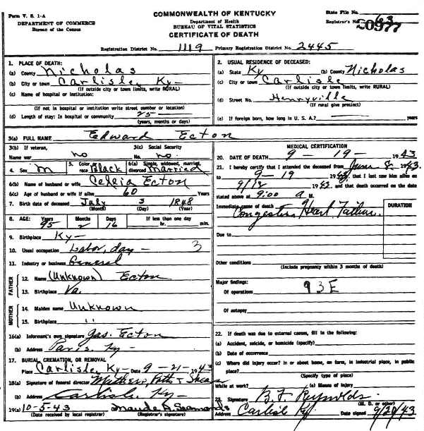 | Date: Wed Apr 12 19:21:49 2006 Submitter: Mary Hatton Death Volume: 1943 Certificate Number: 20977 Surname: ECTON Given Name: Edward Date of Death: 19 Sep 1943 Place of Death: Henryville, Carlisle, Nicholas Co., Ky. Race or Color: Black Sex: Male Marital Status: Married Spouse's Name: Celeia Ecton Spouse's Age: Cause of Death: Congestive Heart Failure Place of Burial: Carlisle, Nicholas Co., Ky. Date of Burial: 21 Sep 1943 Residence: Henryville, Carlisle, Nicholas Co., Ky. Occupation: Day Labor-General Date of Birth: 03 Jul 1848 Age: 95 Birth Place: Kentucky Father's Name: (Unknown) Ecton Father's Birth Place: Kentucky Mother's Name: Unknown Mother's Birth Place: Unknown Informant: Jas. Ecton, Paris, Bourbon Co., Ky. Undertaker: Mathers, Potts, & Shearer(?), Carlisle, Nicholas Co., Ky. Comments and Corrections: