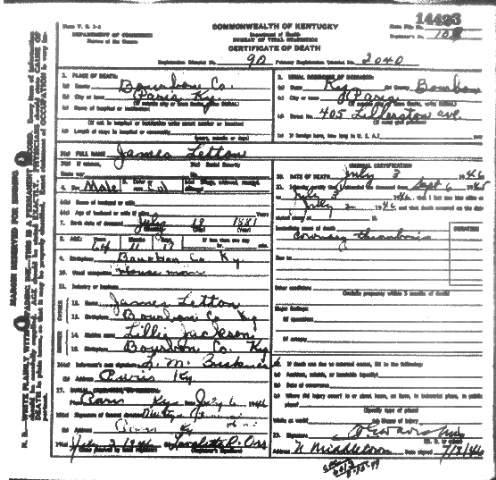 | Date: Fri May 19 20:47:44 2006 Email: mahat@adelphia.net Submitter: Mary Hatton Death Volume: 1946 Certificate Number: 14423 Surname: LETTON Given Name: James Date of Death: 03 Jul 1946 Place of Death: Paris, Bourbon Co., Ky. Race or Color: Colored Sex: Male Marital Status: Not Stated Spouse's Name: Spouse's Age: Cause of Death: Cornary Thrombosis Place of Burial: Paris, Bourbon Co., Ky. Date of Burial: 06 Jul 1946 Residence: Paris, Bourbon Co., Ky. Occupation: House Man Date of Birth: 19 Jul 1881 Age: 64 Birth Place: Bourbon Co., Ky. Father's Name: James Letton Father's Birth Place: Bourbon Co., Ky. Mother's Name: Lillie Jackson Mother's Birth Place: Bourbon Co. Ky. Informant: L. M. Buckner, Paris, Bourbon Co. Ky. Undertaker: Martyn-Hurley, Paris, Bourbon Co., Ky. Comments and Corrections: