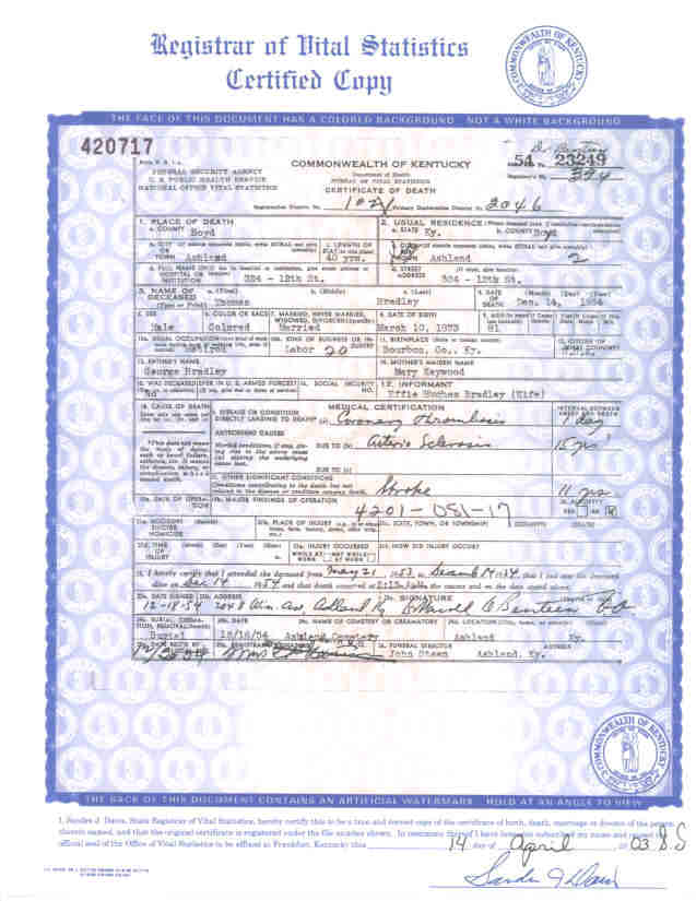 Death Volume: 1954 Certificate Number: 23249 Surname: BRADLEY Given Name: Thomas Date of Death: 14 December 1954 Place of Death: Ashland, Boyd Co., KY Race or Color: Colored Sex: Male Marital Status: Married Spouse's Name: Spouse's Age: Cause of Death: Coronary Hrombosis Place of Burial: Ashland Cemetery Residence: 324 12th Street Occupation: Retired - Labor Date of Birth: 10 March 1873 Age: 81 Birth Place: Bourbon Co., KY Father's Name: George Bradley Father's Birth Place: Mother's Name: Mary Kaywood Mother's Birth Place: Informant: Comments and Corrections: See Descendants of William Bradley