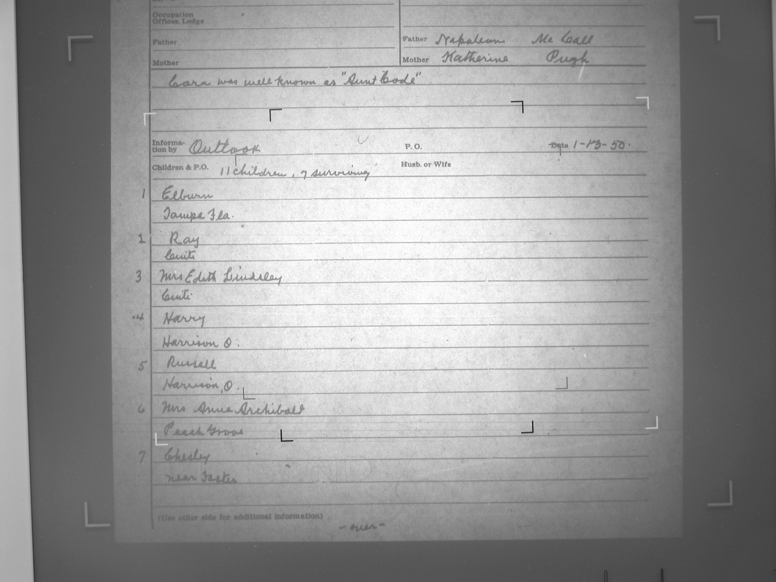 Married Cora Ellen McCall, d/o Napolean
