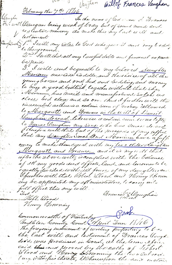 Pendleton County Wills - Frances Vaughan - Contributed By: Michael Barrett The E. E. Barton Collection of Northern Kentucky Families, is a collection of genealogical and family history files and various other types of records compiled in the early to mid 1900s by Edward Everett Barton (1870-1951), a Pendleton County, Kentucky lawyer. All of his papers have been preserved and microfilmed. This transcribed Index covers Will Books 1 - 3. All spelling was kept as shown on the originals. Scanned at FHL By: Joy fisher Transcribed & Formatted By: Suzanne Shephard