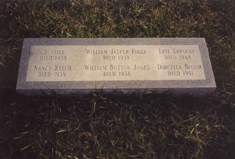 On March 19, 2001 we had the pleasure of meeting with Mr. Stanley Bishop, of Hays Station Road, and taking a tour of the old infirmary grounds. We being Nancy Bray, and myself, Greg Justice. We first visited the newer cemetery which is located in the back yard of Roy and Janice Green. Stanley Bishop had a tombstone placed at this grave site, and gave the information for the known people that were buried there. John Peoples, of Peoples Funeral Home, had donated the stone. Those that are named on the stone are as follows: Justice - d. 1938, William Jasper Fogle - d. 1939, Levi Sargent - d. 1948, Nancy Kelch - d. 1939, William Button Jones - d. 1938, and Dorcella Bloom - d. 1951. Roy and Janice Green have this area cleared and have planted irises at the site.