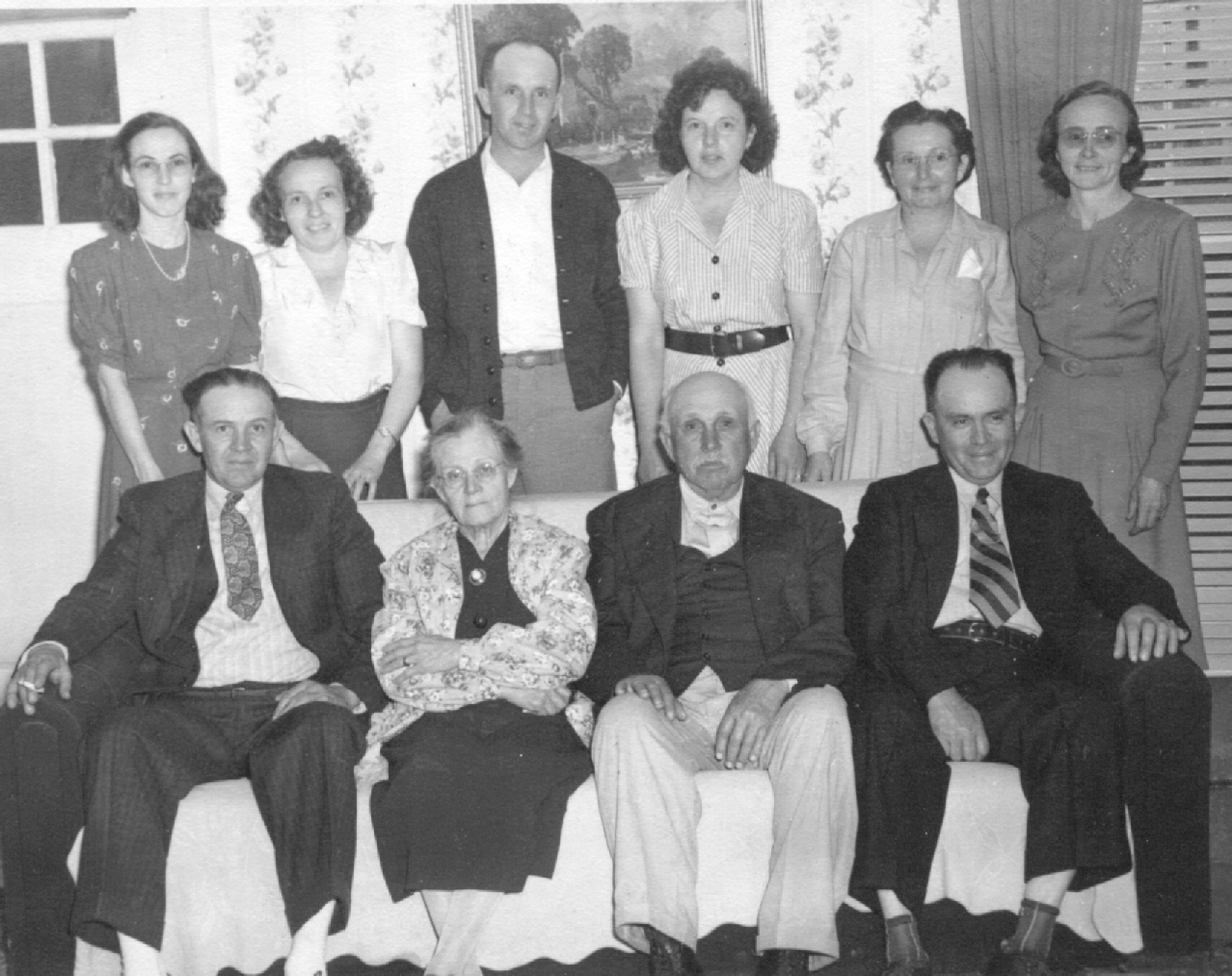 Farris Family The picture was taken at the home of William Lee Farris Jr. in Coburg, Adair Co. in the early 1940's. Front row: Raymond Farris, Matilda Alice Farris nee Cave, William Lee Farris Jr., Leslie Farris. Back Row: Willard Cundiff nee Farris, Estelle Bault nee Farris, Rollin Miller Farris, Ethel Scott nee Farris, Audrey Bennett nee Farris and Mary Whitney nee Farris. Not pictured, Johnny Farris. Submitted By: Morris and Lavelle Shepherd |