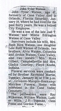 This obit was sent to my grandma, Lena Watson Roberts, from Kentucky for John Tyler Watson his parents were Joel T. & Mintie Edrington Watson. There was no year on this but I found his death in the SS death index and John Tyler died 19 Jan 1980. Prior to that I had assumed it was an older death and had been sent to her father, Alexander Watson, which is not the case. He had died many years prior and this death was just 3 years prior to my grandmother’s death. We have had a devil of a time finding other family (above or beside) for Alexander’s father Stephen Watson in either Tennessee/N.C. or Kentucky. I feel this obit might be the link we’ve been looking for as someone from Kentucky surely sent it to my grandmother and it was important enough to her for her to keep. If anyone has information about this family, please contact me... thanks!