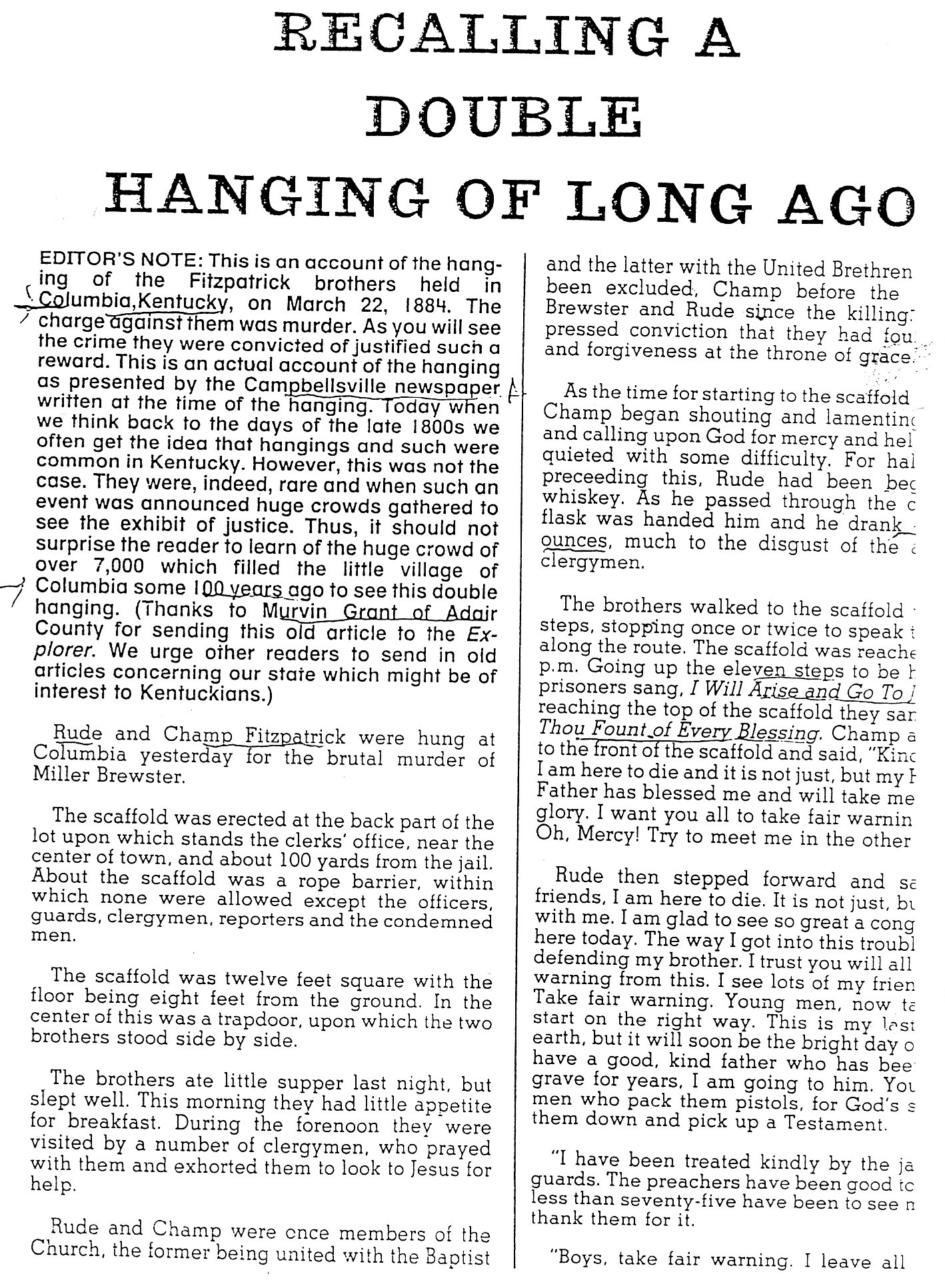 The following newspaper articles were submitted by Morris Shepherd and document the double hanging of Rude and Champ Fitzpatrick on March 22, 1884. The pair were executed after being accused of the murder of Miller Brewster. This account came originally from the Campbellsville News. (from a reprint of The Kentucky Explorer, February 1987).
