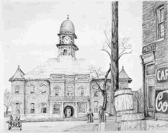 courthouse was a large two story brick building having a cupola on top with clocks facing