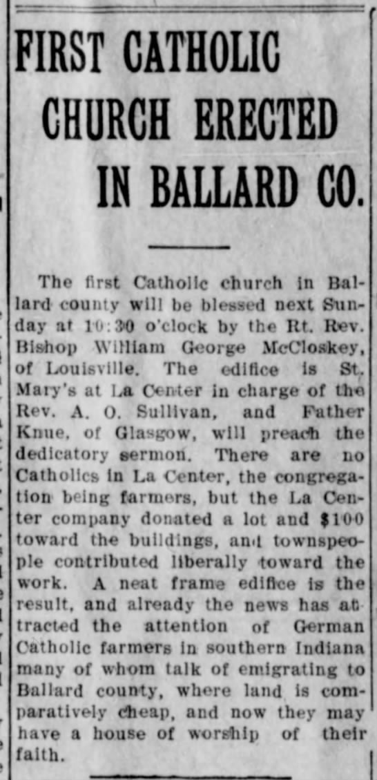 FIRST CATHOLIC CHURCH ERECTED IN BALLARD CO Tho first Catholic church In Ballard county will be