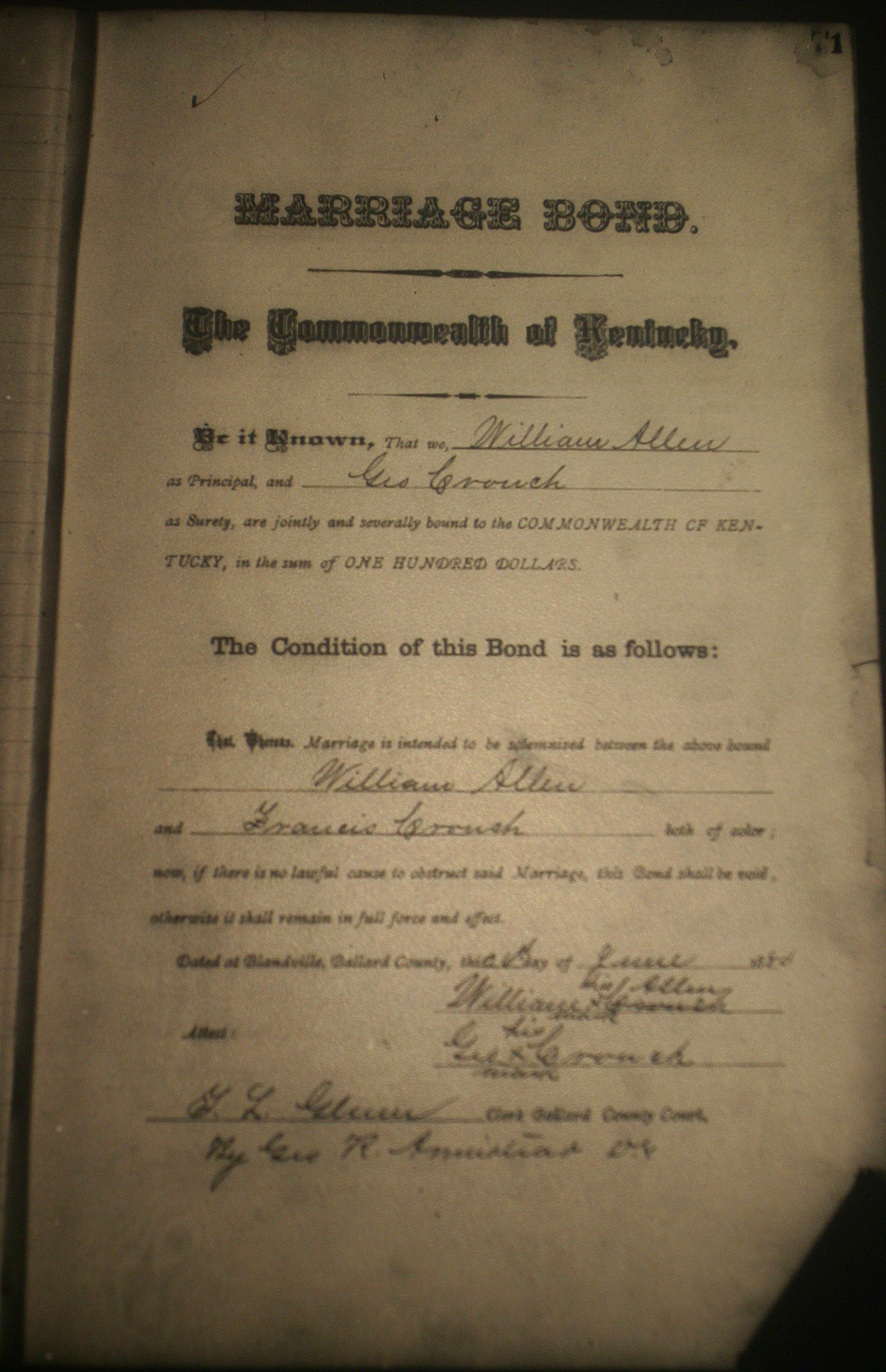 | Allen, William | Crouch, Frances | 22 June 1888 | Residence of G. Crouch in Ballard Co. | George Crouch & Bob Enders(?) | 21 June 1880 | William Allen & Geo. Crouch | 1 |