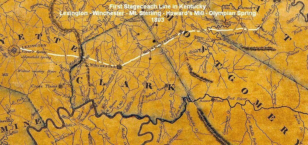 In 1803, John Kennedy a Lexington Resident established Kentucky's first stage coach line. It ran the 47 miles between Lexington and Mud Lick Spring following the same route as the above mentioned Iron Works Road. A post office opened in Olympian Springs in 1811.