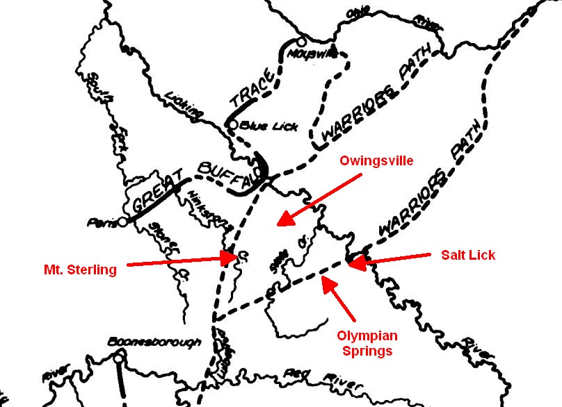 The first route through this area was the Warrior's Path. It was part of a network of trails that had been used by Native Americans for centuries. This particular section ran between the Cumberland Gap to the south and Ohio to the north. The trail forked in Montgomery County near the headwaters of the Hinkston and Lulbegrud Creeks. From there one trail went northward through present day Mt. Sterling and on through the north edge of Bath County to Blue Lick at the Licking River. The other fork went northeast crossing Slate Creek at Howard's Mill, on through Mud Lick (Olympian) Springs in Bath County to the Licking River and up into Ohio.