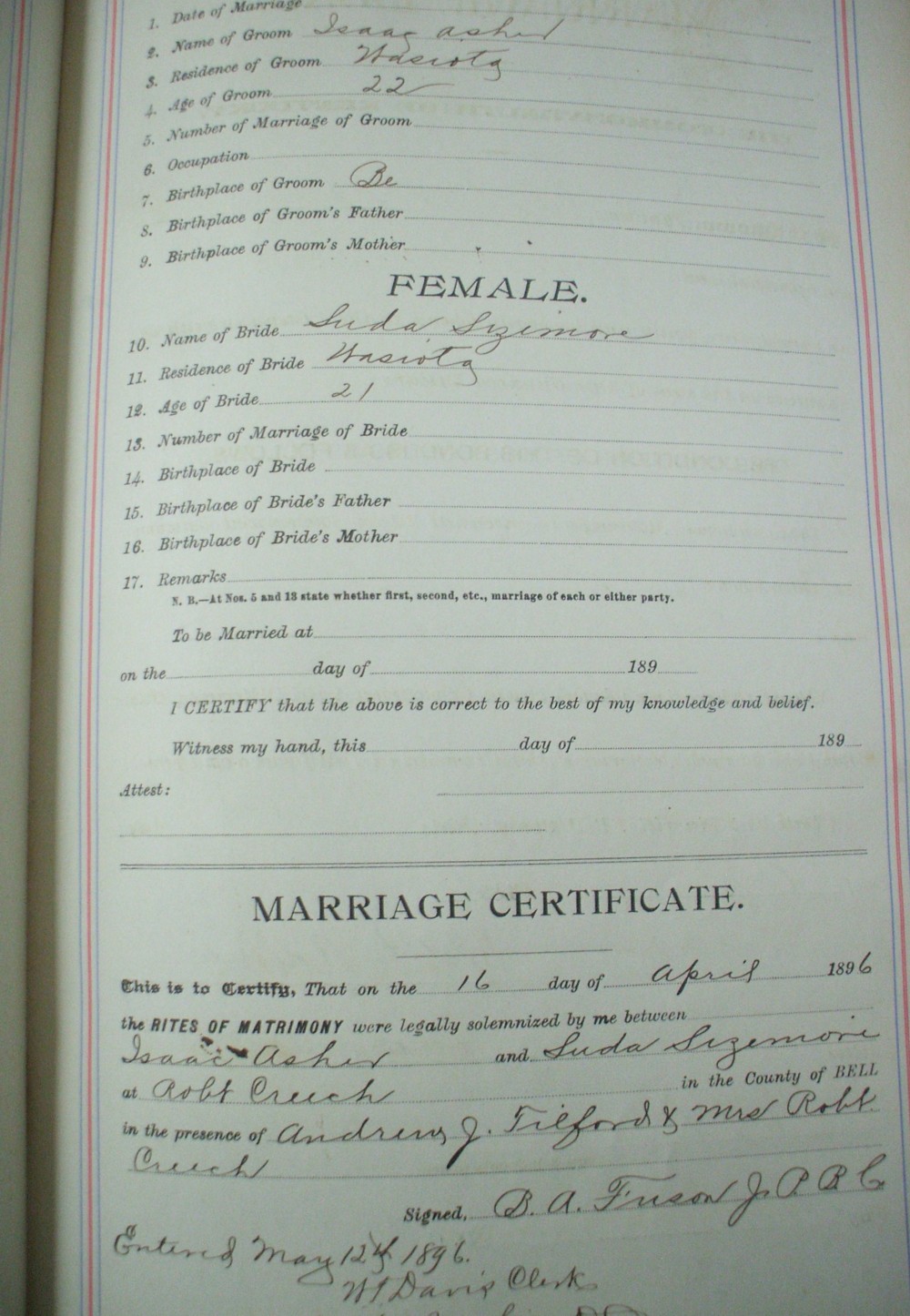 | Asher | George | Asher | Mary | 21 | 42 | 07/23/1902 | |