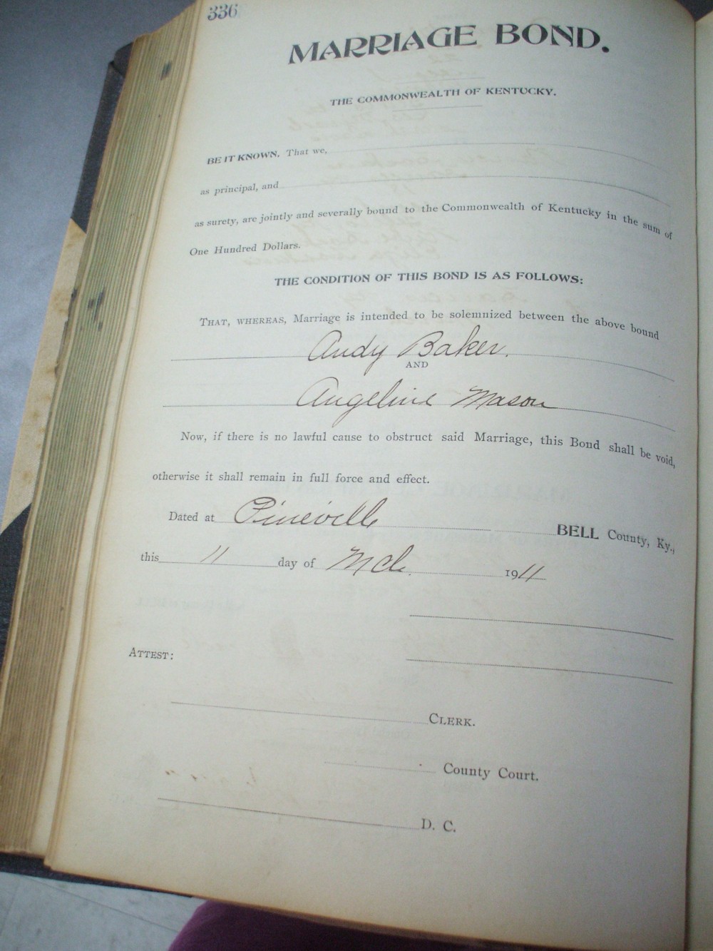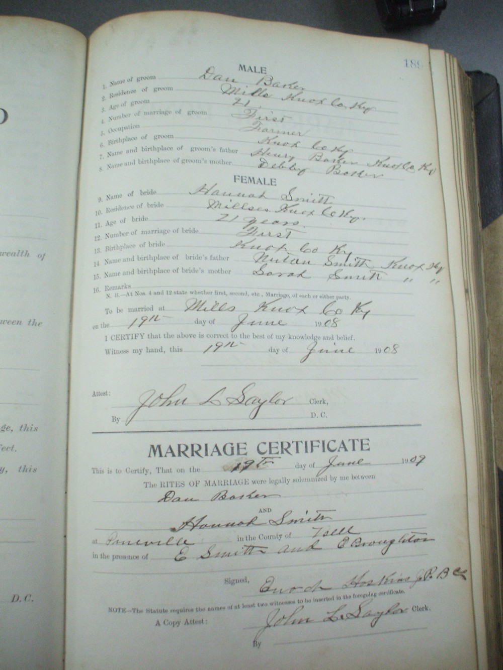 | Baker | John | Bledsoe | Bertha | 9 | 334 | 10/31/1908 | |
