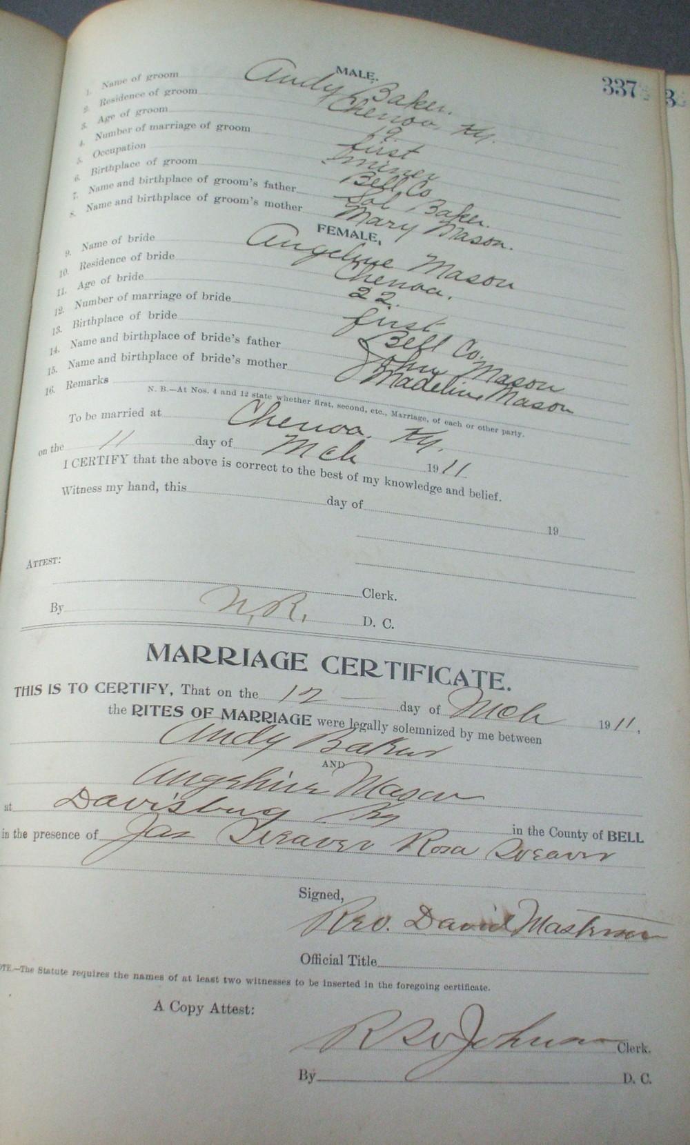 | Baker | Andy | Mason | Angeline | 8 | 336 | 03/12/1911 | |