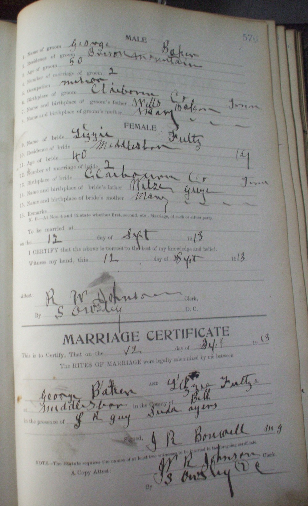 | Baker | George | Fultz | Lizzie | 22 | 575 | 09/12/1913 | |