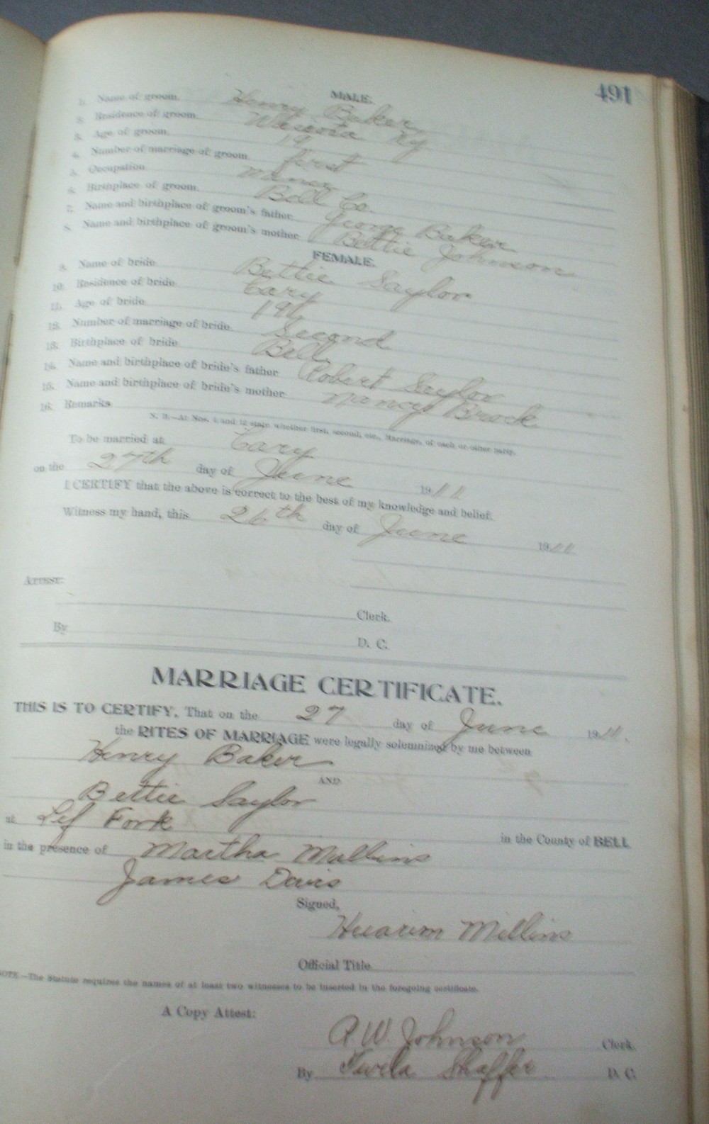 | Baker | Henry | Saylor | Bettie | 8 | 490 | 06/27/1911 | |