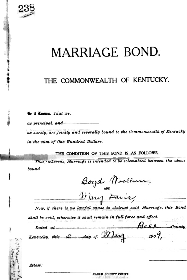 | 03/98 | BRADLEY Age 26 | ELLEN WILDER Age 17 | 4/27/1922 | George Woolum Bell Co Ky | Josie Woolum Bell Co Ky | Dan Wilder | Nancy C Wilder | |