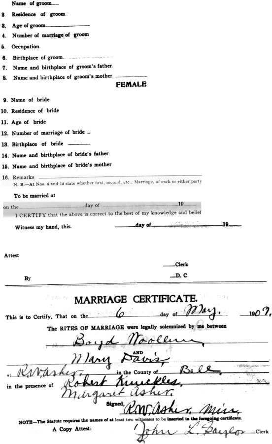 | 10/388 | BRADLEY Age 17 | KITTY ASHER Age 17 | 9/4/1912 | George Woolum Bell Co Ky | Josie Woolum Bell Co Ky | Lucy Keith | His 1st Her 1st | |