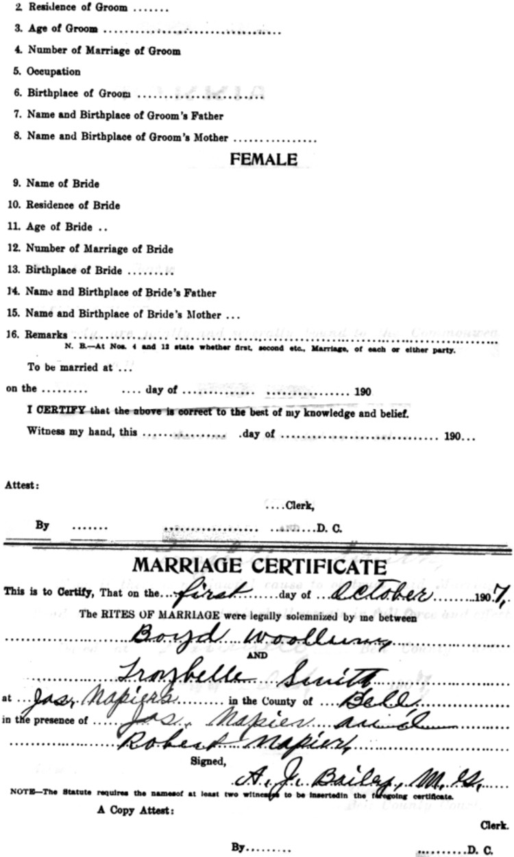 | 18/364 | JAMES F Age 23 | MARY BELL WILSON Age 17 | 11/24/1907 | Leonard Woolum | Emily Napier | A P Wilson | Elizabeth H�.. | His 1st Her 1st |