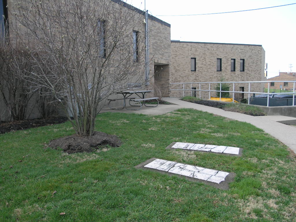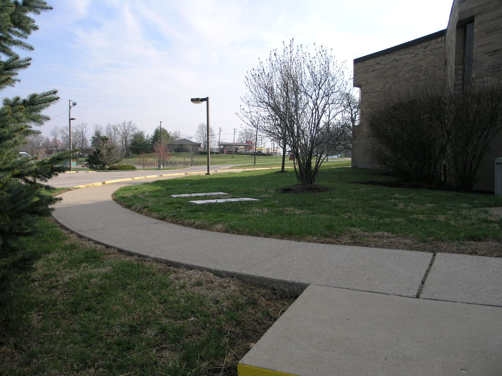 photo was taken standing in front of the headstones on the sidewalk behind the Administration building,