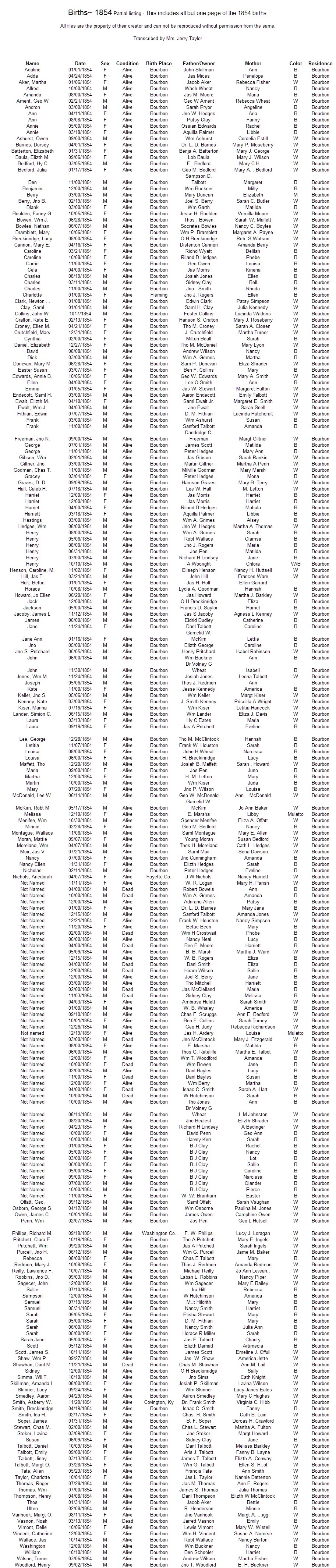 Rebecca 08/00/1854 F Alive Bourbon Chas E Talbott Mary B Bourbon