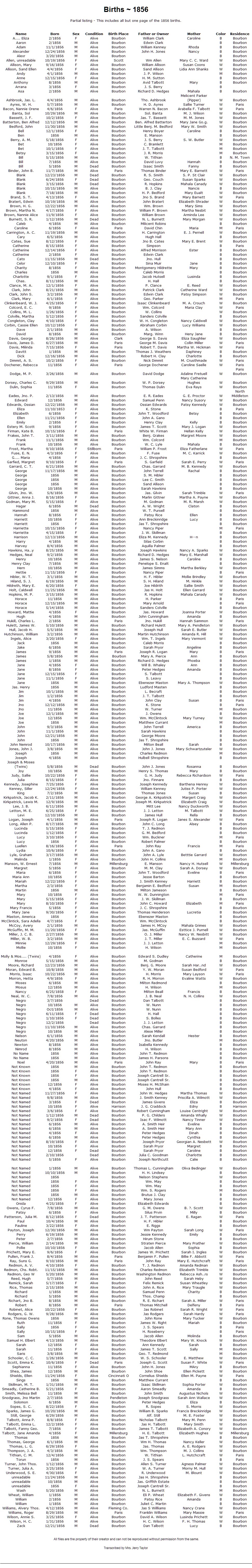 Berry, A. M. 5/18/1856 F Alive Bourbon J. S. Berry S. W. Butler W Bourbon