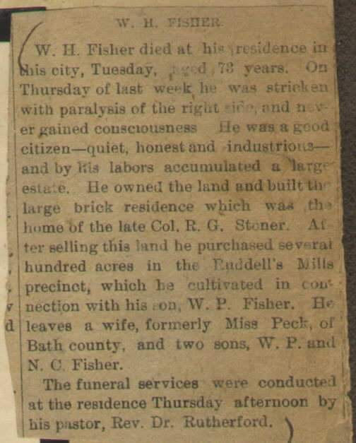 W.H. Fisher dies; Col. R.G. Stoner; wife: Miss Peck; sons: W.P. Fisher and N.C. Fisher; Rev. Dr. Rutherford